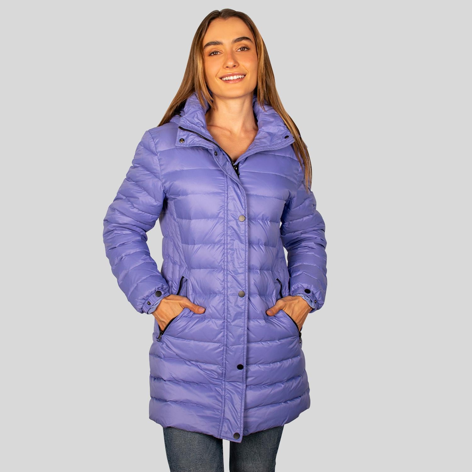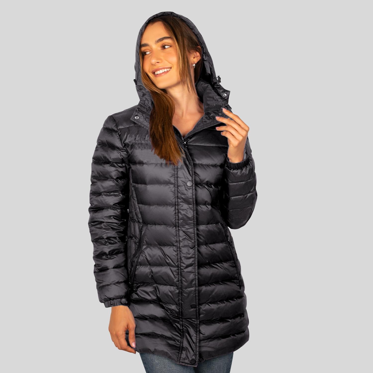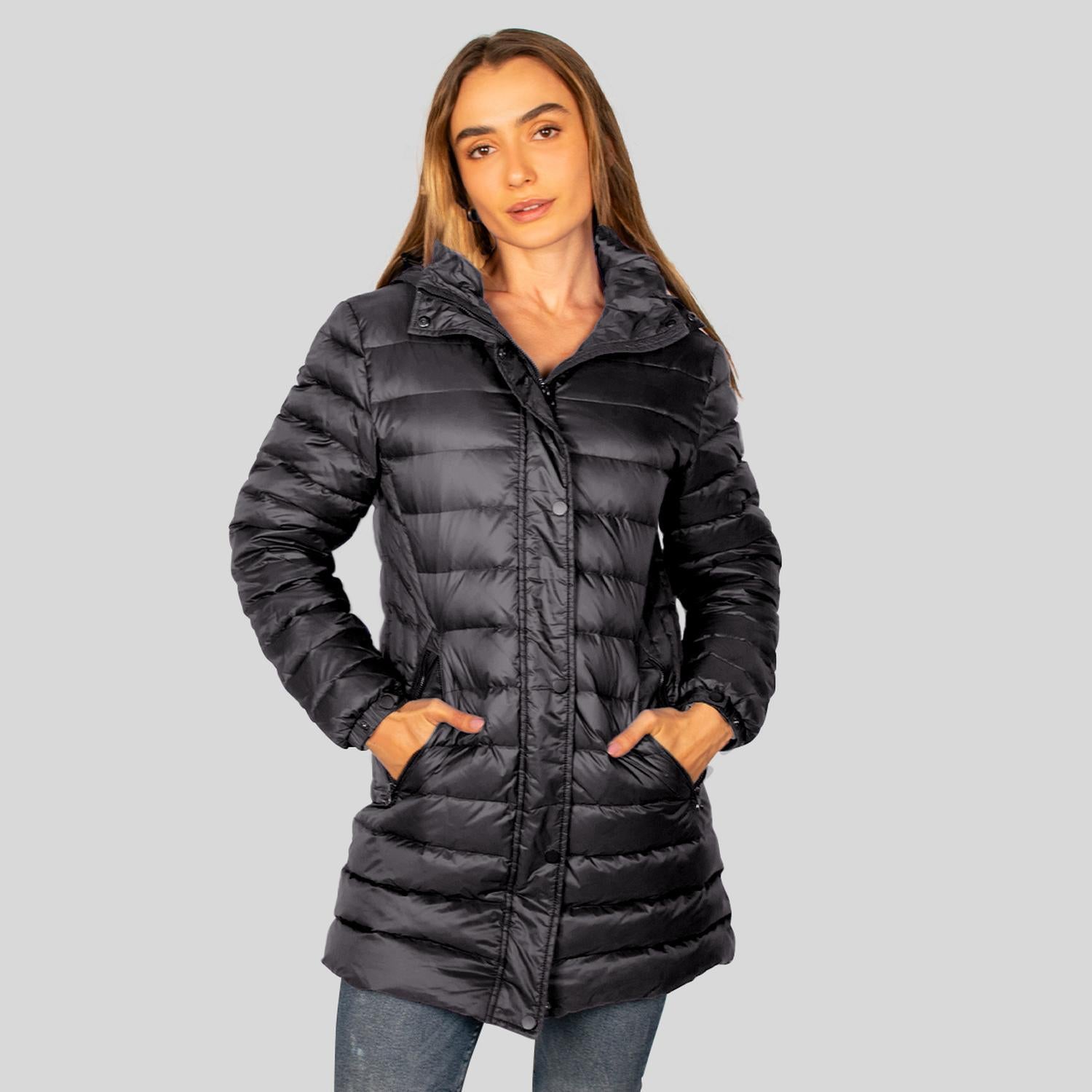 Chamarra capitonada larga de pluma: Retiene aire en sus celdas que impiden la fuga de calor corporal y bloquean el frío exterior creando un aislamiento térmico. Suelen ser más cómodas y permiten mayor libertad de movimiento. Su corte largo cubre hasta la cadera o muslos