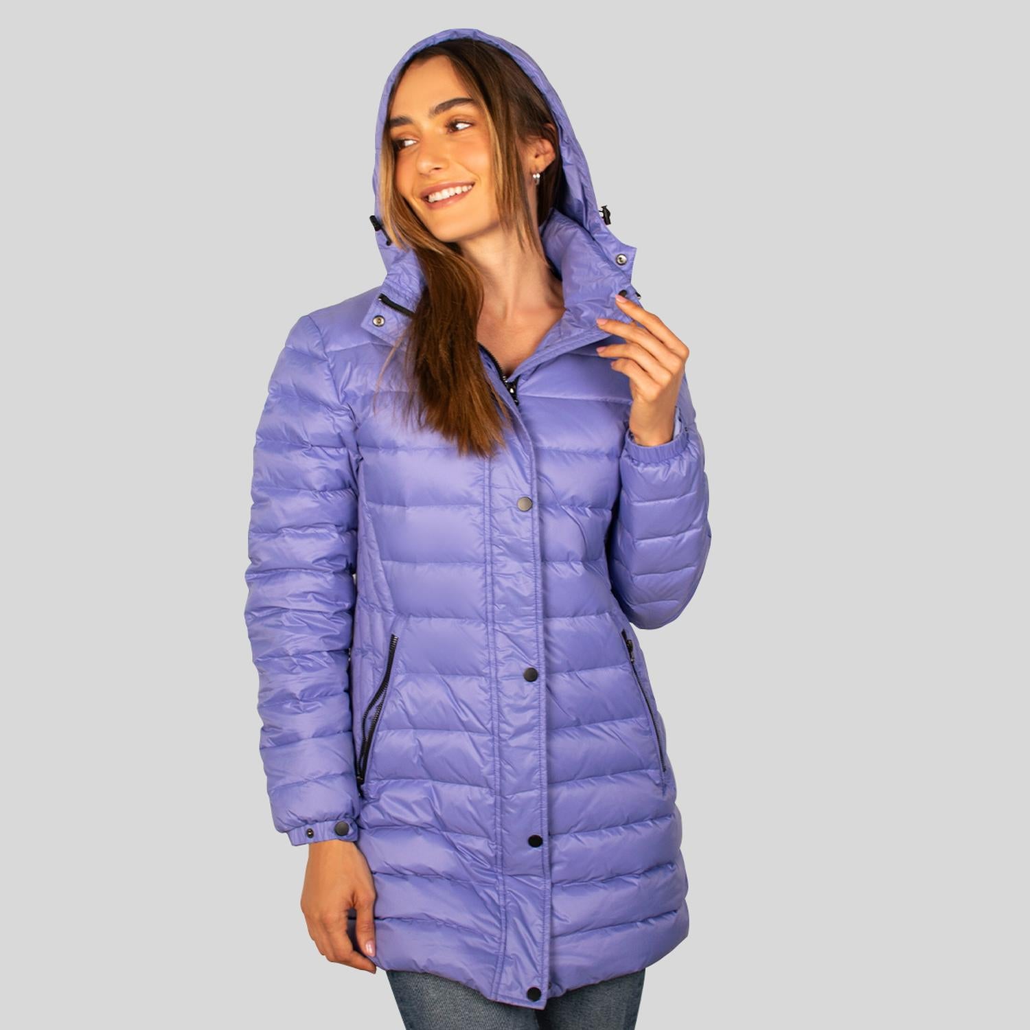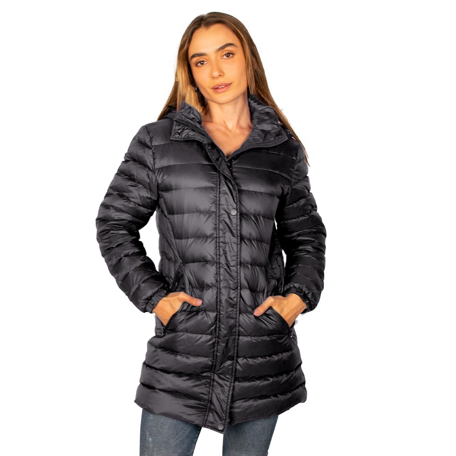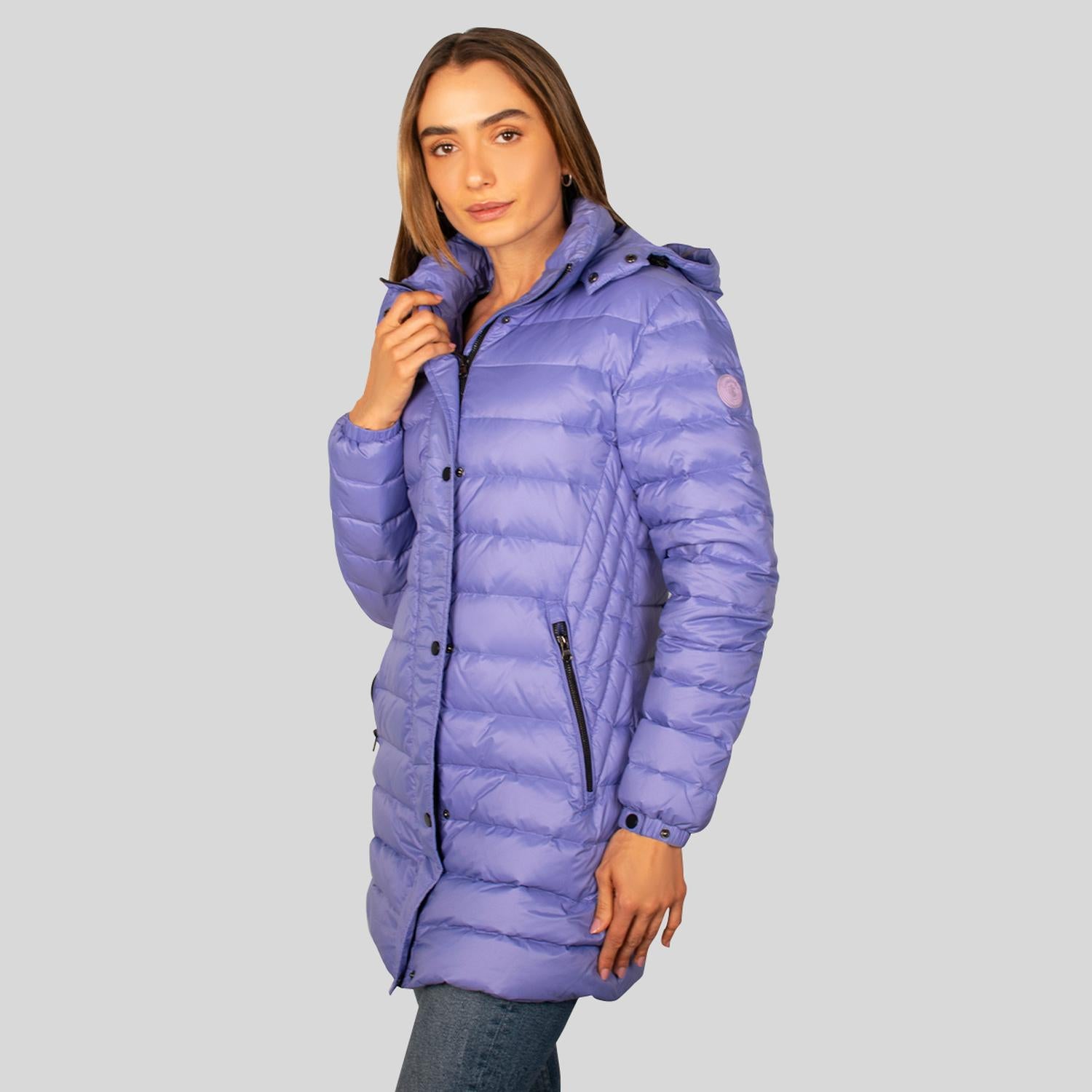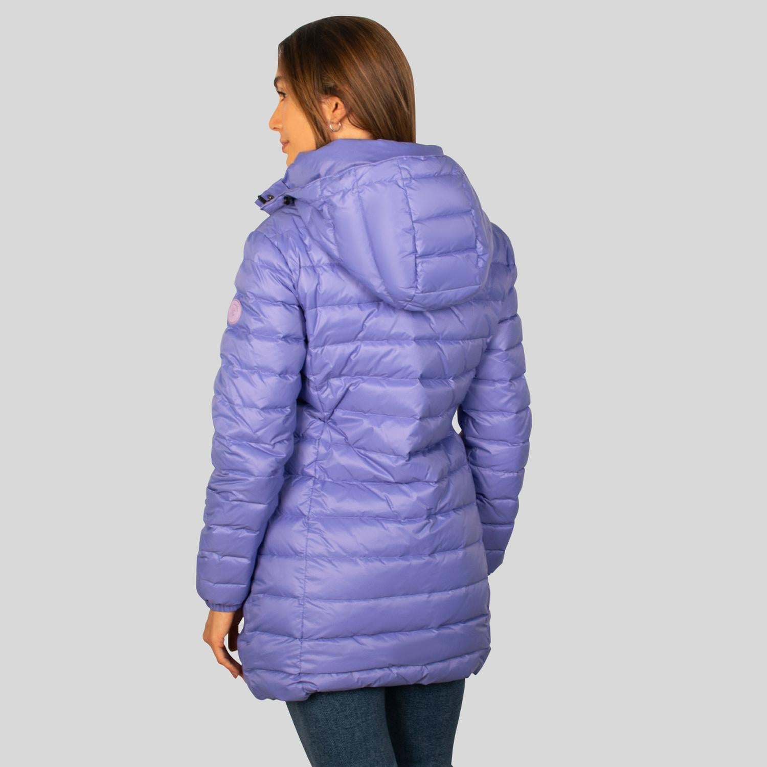 Chamarra capitonada larga de pluma: Retiene aire en sus celdas que impiden la fuga de calor corporal y bloquean el frío exterior creando un aislamiento térmico. Suelen ser más cómodas y permiten mayor libertad de movimiento. Su corte largo cubre hasta la cadera o muslos